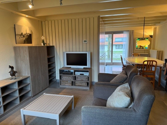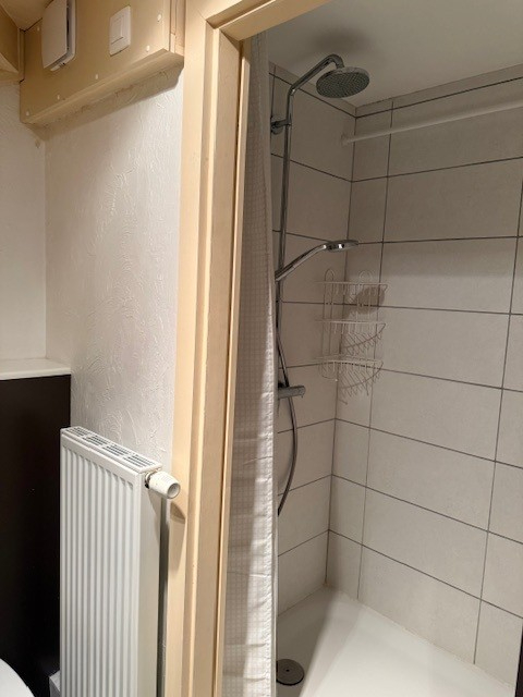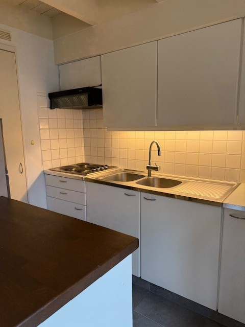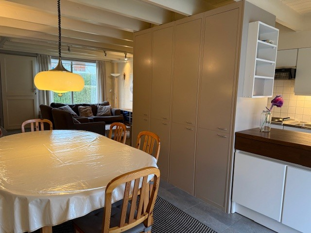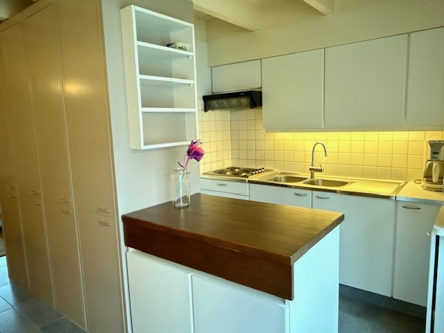 La cuisine fonctionnelle est dotée d’un débarras pratique avec accès direct. Le séjour aménagé avec beaucoup de charme séduit par son ambiance chaleureuse et ses meubles encastrés astucieux, apportant un espace de rangement optimal et une finition soignée.